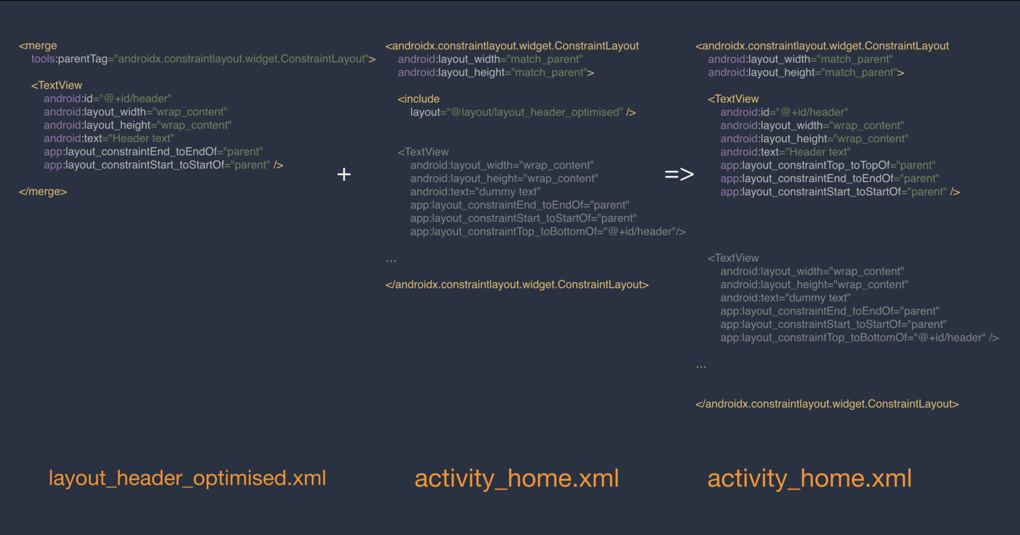 기존에 텍스트 뷰를 감싸던 ConstraintLayout을 merge 태그(parentTag로는 include되는 부모 Layout을 지정)로 대체하고 나면